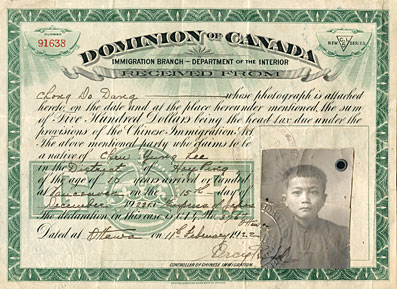The Head Tax certificate of Chong Do Dang. Library and Archives Canada, MG55/30-No166, reproduction copy number e008441646